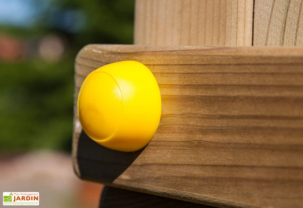 Cette aire de jeux pour enfants est fabriquée en pin traité par autoclave classe 3, un traitement en profondeur permettant de protéger le bois des intempéries. Le bois ne craindra donc ni l’humidité, ni les insectes susceptibles de le détériorer. Il est également certifié FSC, ce qui signifie qu’il provient de forêts gérées dans le respect de l’environnement.