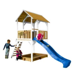 L’aire de jeux en bois Gaia de chez Fungoo vous est proposée dans une configuration composée d’une tour avec plateforme, d’un toboggan en plastique de 2,20 m de long, d’un portique double, d’une échelle de corde et d’une corde à nœuds. Cette aire de jeux d’extérieur est livrée en kit, accompagnée de tous les éléments nécessaires à son montage (ensemble d’outils, visserie en inox, crochets pour balançoires et kit d’ancrage).