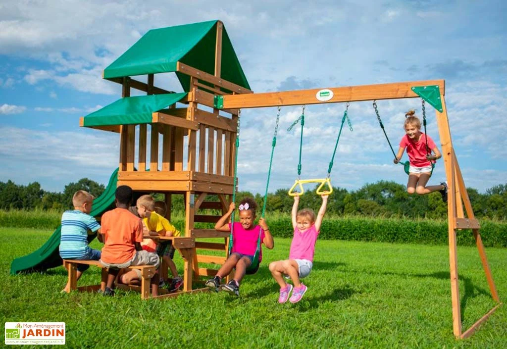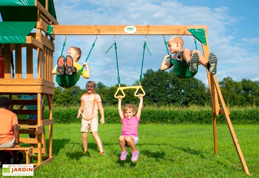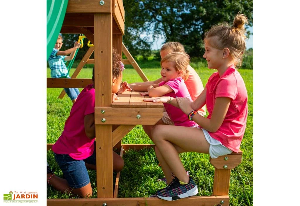 Cette aire de jeux pour enfant mobilise une solide structure en cèdre, un bois très résistant et qui ne demande aucun entretien particulier. Ce type de bois est en effet imputrescible, ce qui signifie qu’il ne craint ni la moisissure, ni les insectes qui pourraient le détériorer. Il n’a donc subi aucun traitement chimique et est recouvert d’une teinture à base d’eau, non nocive pour la santé de vos enfants.