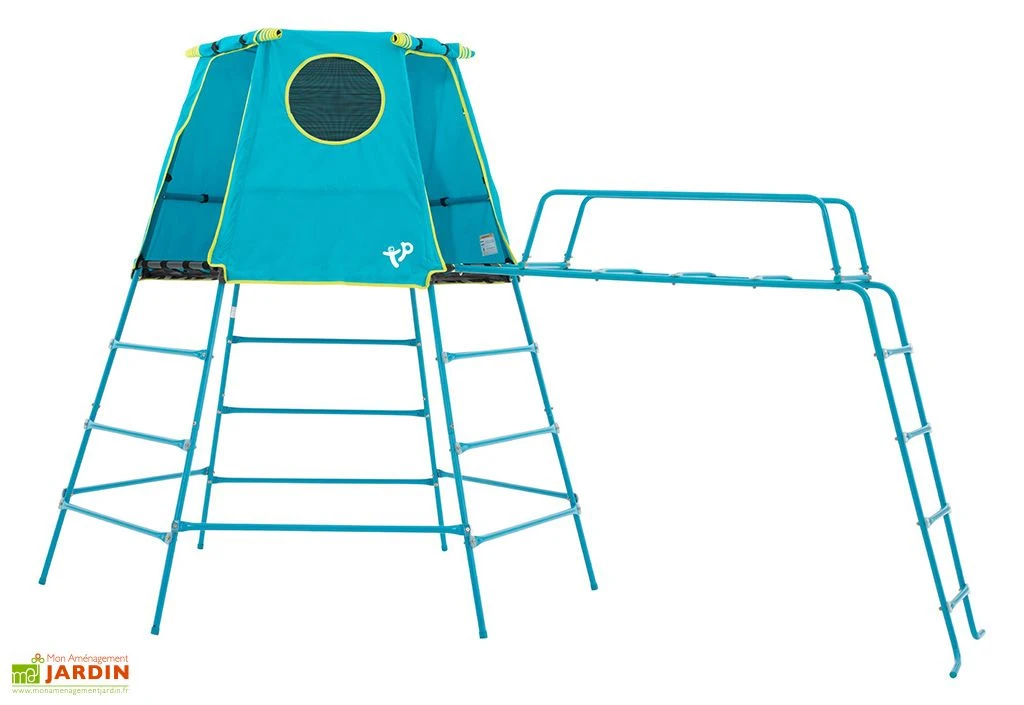 La structure de l’aire de jeux d’extérieur est fabriquée en acier galvanisé dans un coloris bleu. Des barreaux permettent à vos enfants d’accéder facilement à la cabane située en hauteur. Le repaire dispose d’une fenêtre d’observation et de deux portes enroulables. Le sol de la cabane est doté d’un tapis de jeu d’aventure.