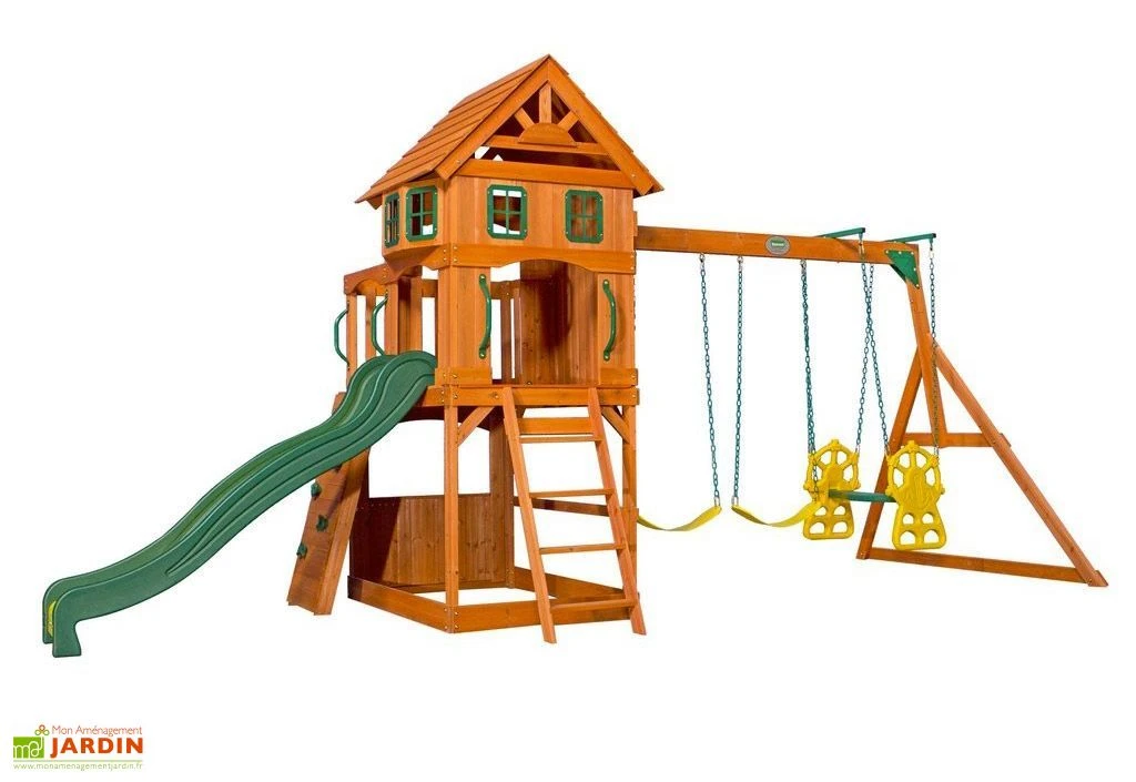 L’aire de jeux est en cèdre tropical, un bois qui résiste naturellement à la moisissure et aux attaques d’insectes et qui ne demande aucun entretien. Elle est peinte avec une teinture à base d’eau et aucun produit chimique n’a été utilisé.