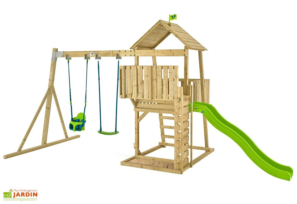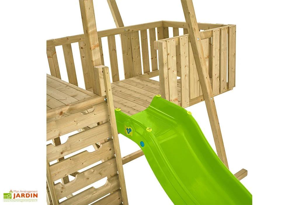 La tour en bois dispose de deux plateformes spacieuses abritées par un toit et d’un belvédère. Ils sont facilement accessibles par une échelle ou par le mur d’escalade. En dessous des plateformes se trouve un bac à sable ombragé permettant à vos enfants de jouer à l’abri des rayons du soleil lors de journées ensoleillées. Le toboggan vert de 2,5 m de long légèrement ondulé assure aux bambins une descente rapide du repaire.
