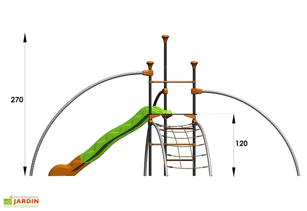 L’aire de jeux comporte un toboggan avec une glissière de 2,63 m de long. Un pont de singe se présentant sous forme d’un cordage à grimper. Une corde tibétaine pour tester sa force et son équilibre. Un tapis volant pour se reposer et discuter entre copains. Une tour centrale pour observer tout le jardin et grimper par tous les côtés. Et une toile d’araignée pour s’amuser à grimper jusqu’en haut.