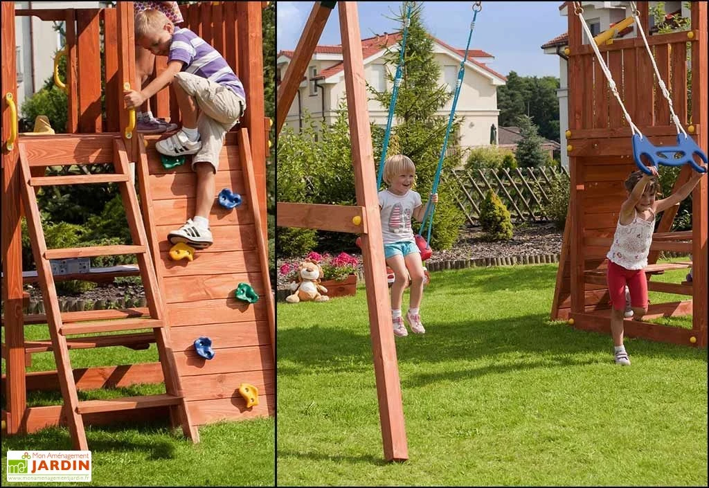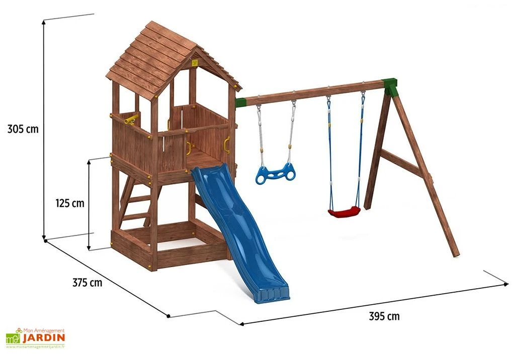 L’aire de jeux est livrée en kit à monter soi-même. La livraison comporte tous les outils nécessaires à son installation, la visserie en inox, un kit de crochets pour les balançoires et des pièces en bois. Le temps de montage est estimé à un peu moins d’une journée à deux. L’aire de jeux bénéficie d’une garantie de 2 ans.