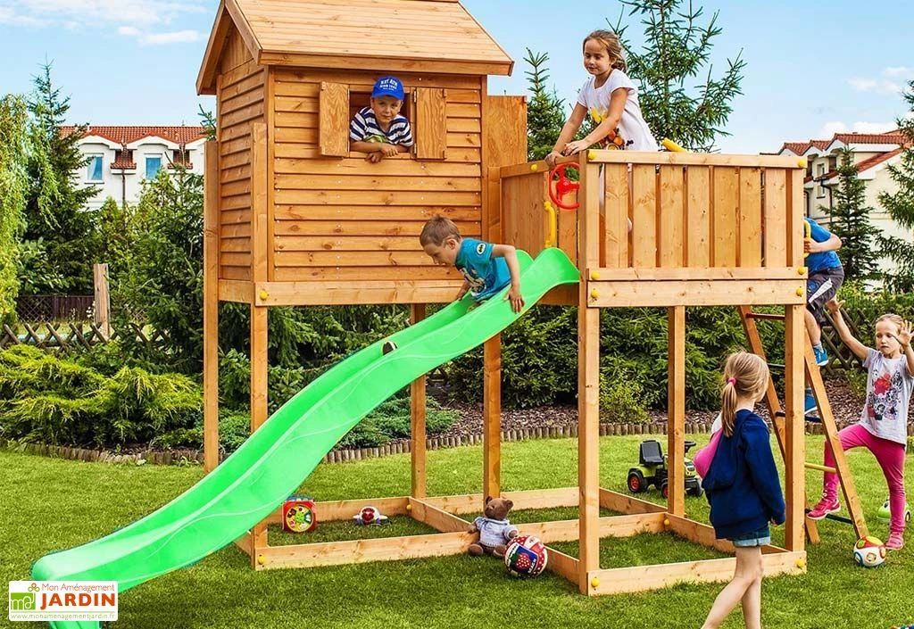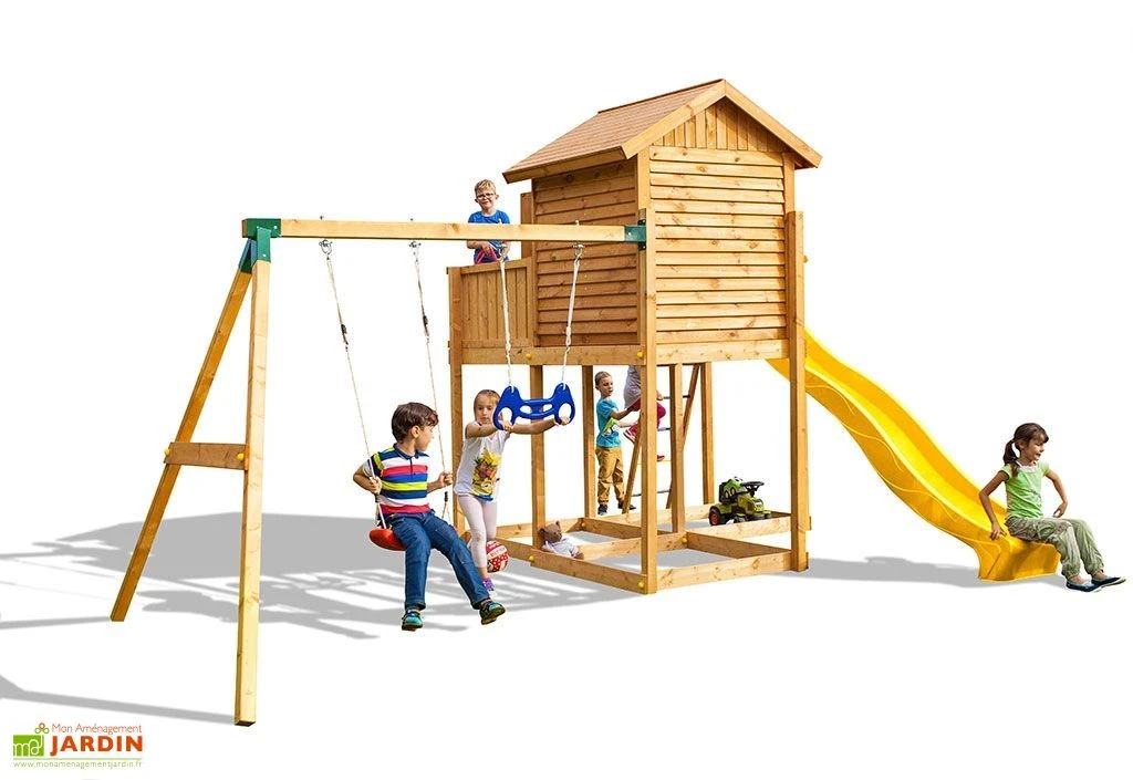 L’aire de jeux est constituée d’une grande tour et d’un portique. La tour dispose d’une plateforme de 240 x 120 cm située à 145 cm du sol. Elle est équipée d’une cabane avec toiture double pente, fenêtre avec volets et porte. L’enfant y accède grâce à une échelle de barreaux en métal et en descend grâce à un toboggan de 290 cm de longueur.