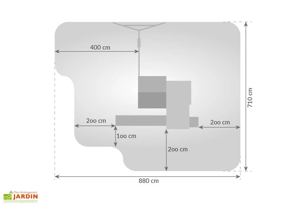 L’aire de jeux en bois de Fungoo est une grande aire de jeux qui convient à l’utilisation simultanée de 11 enfants. Le bois est recouvert d’une lasure permettant de le protéger. Elle mesure 4,15 m de longueur, 4,40 m de largeur et 2,85 m de hauteur.