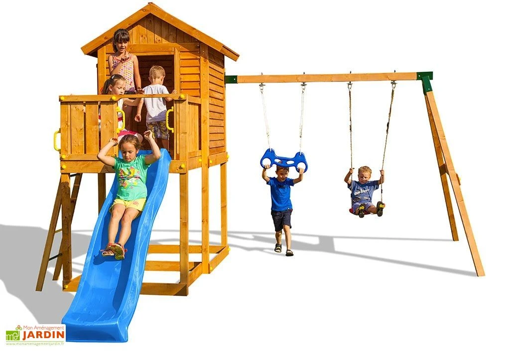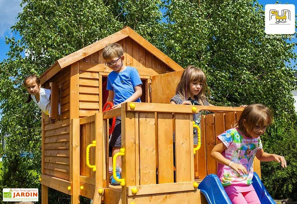 Cette aire de jeux Fungoo est fabriquée en pin sylvestre lasuré coloris Teck. Certifié FSC, ce bois est issu de forêts gérées de manière responsable et respectueuse de l’environnement. Avec des dimensions de 4,40 x 4,30 m, pour 2,85 m de haut, cette aire de jeux pourra accueillir sept enfants simultanément. Elle répond aux dernières normes en vigueur EN-71, mais est cependant réservée à une utilisation d’ordre privé. Cette aire de jeu est à monter soi-même et tous les éléments nécessaires sont fournis.