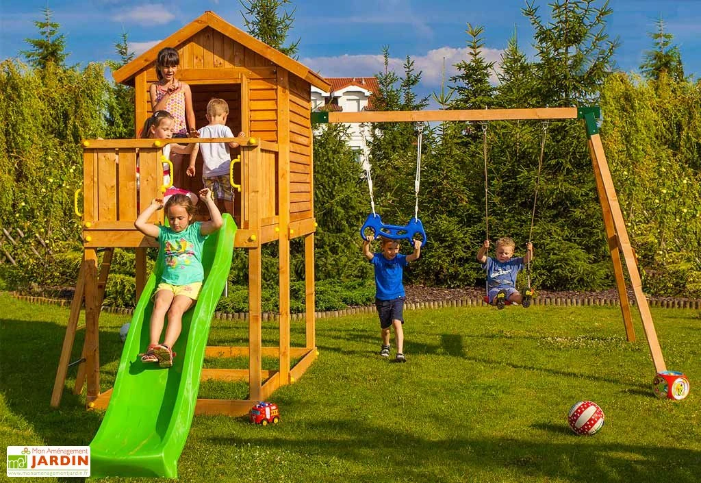 L’aire de jeux est composée d’une maisonnette montée sur pilotis. Elle se situe sur une plateforme de 120 x 140 cm de côté et culmine à 1,25 m de hauteur. L’accès se fait grâce à une petite échelle. Cette aire de jeux comprend également un toboggan de 2,20 m de longueur ainsi qu’un portique avec balançoire et trapèze. La cabane possède par ailleurs une porte et une fenêtre avec volets.