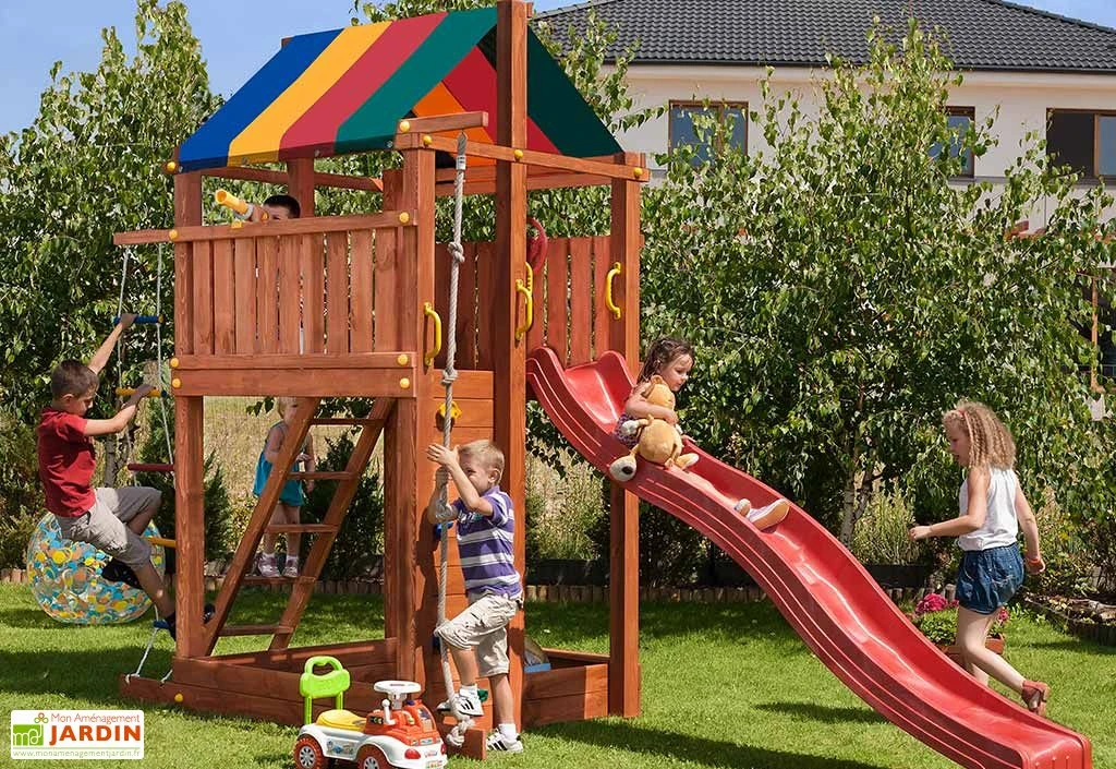 L’aire de jeux en bois certifié FSC recouvert d’une lasure de Fungoo est composée d’une grande tour de 2,90 m de hauteur sur laquelle l’enfant peut grimper de 4 façons différentes :