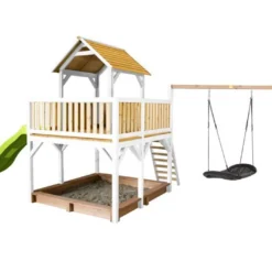 L’aire de jeux Safari Pumba Play Tower de chez Axi comprend une tour avec plateforme, un toboggan en plastique de 2,28 m de long et un bac à sable qui pourra contenir jusqu’à 300 kg de sable (non fourni). Le toboggan pourra même être raccordé à une arrivée d’eau les jours de grosses chaleurs !