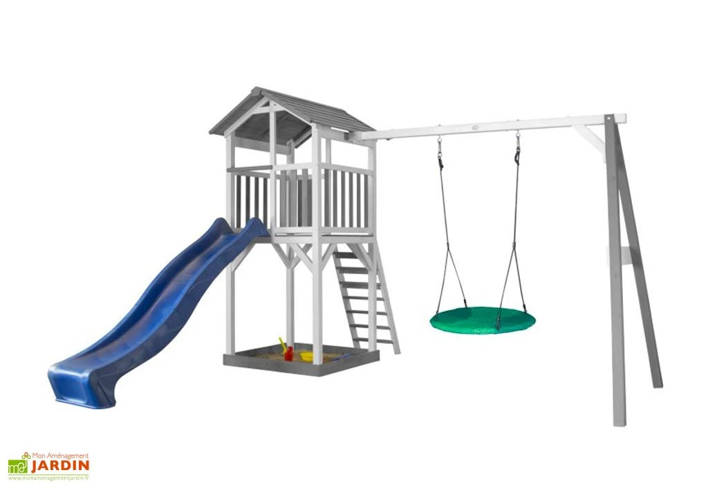L’aire de jeux d’extérieur Beach Tower de chez Axi associe une tour avec toboggan à un portique équipé d’une balançoire nid d’oiseau. Le premier, conçu en plastique, possède une longueur de glisse de 220 cm et est disponible dans deux coloris au choix. La balançoire possède quant à elle une structure en acier et est revêtue d’un tissu synthétique rembourré à l’aide de mousse. Elle pourra être aisément réglée en hauteur.