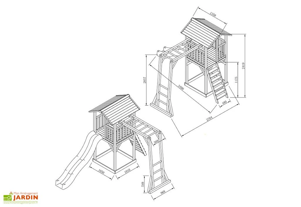 Cette aire de jeux en bois mesure 2,70 x 3,49 m, pour 2,41 m de haut. Elle est livrée en kit, à monter soi-même, et occupera une surface de 9,42 m² une fois installée dans votre jardin. Notez enfin qu’afin de faciliter le montage, les différents éléments qui composent cette tour de jeux sont pré-percés et prêts à être assemblés.