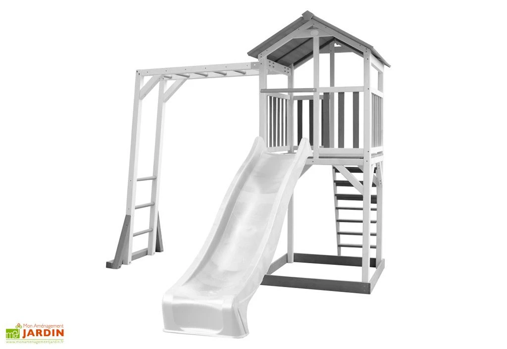 L’aire de jeux Beach Tower de chez Axi propose une combinaison destinée aux enfants âgés d’au moins 3 ans associant toboggan, barres de singe et bac à sable. Elle mobilise en effet une tour avec plateforme qui dessert un toboggan en plastique de 220 cm de long, un module d’escalade sous la forme de barres de singe et un emplacement pour bac à sable, situé sous la tour (sable non fourni). Le tout est conforme aux normes CE et EN71.