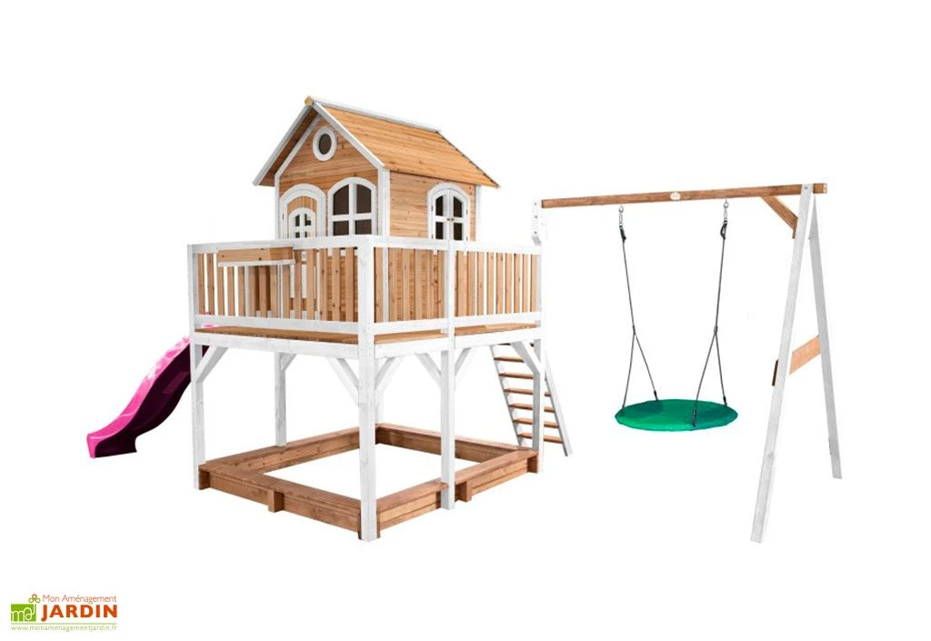 L’aire de jeux de jardin Liam de la marque Axi est pensée pour permettre aux jeunes enfants, dès 3 ans, de s’amuser en toute sécurité. Elle se compose d’une maisonnette montée sur pilotis (hauteur de la plateforme : 118 cm) facilement accessible via une échelle légèrement inclinée et d’un portique équipé d’une balançoire nid d’oiseau. Le tout est conforme aux normes CE et EN71.