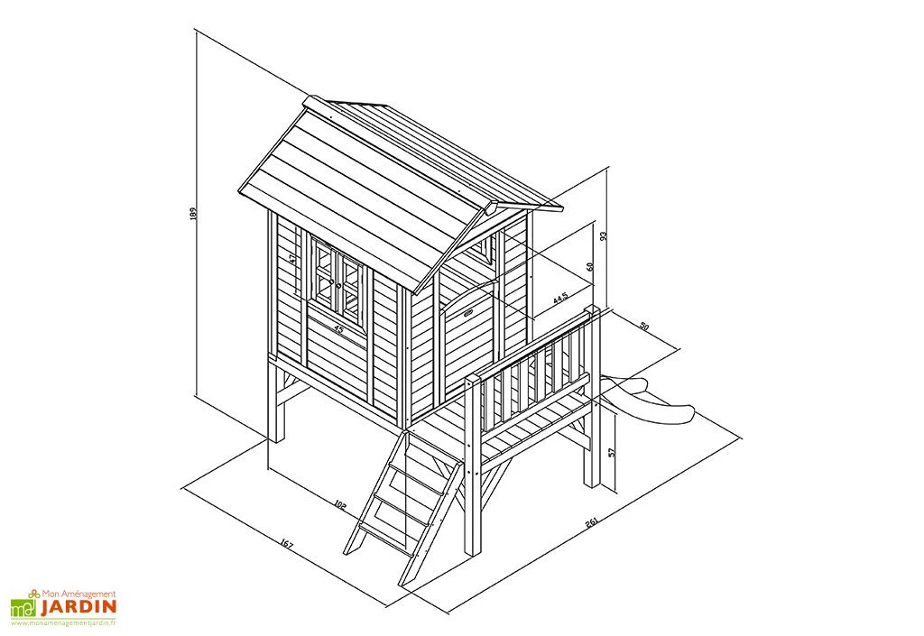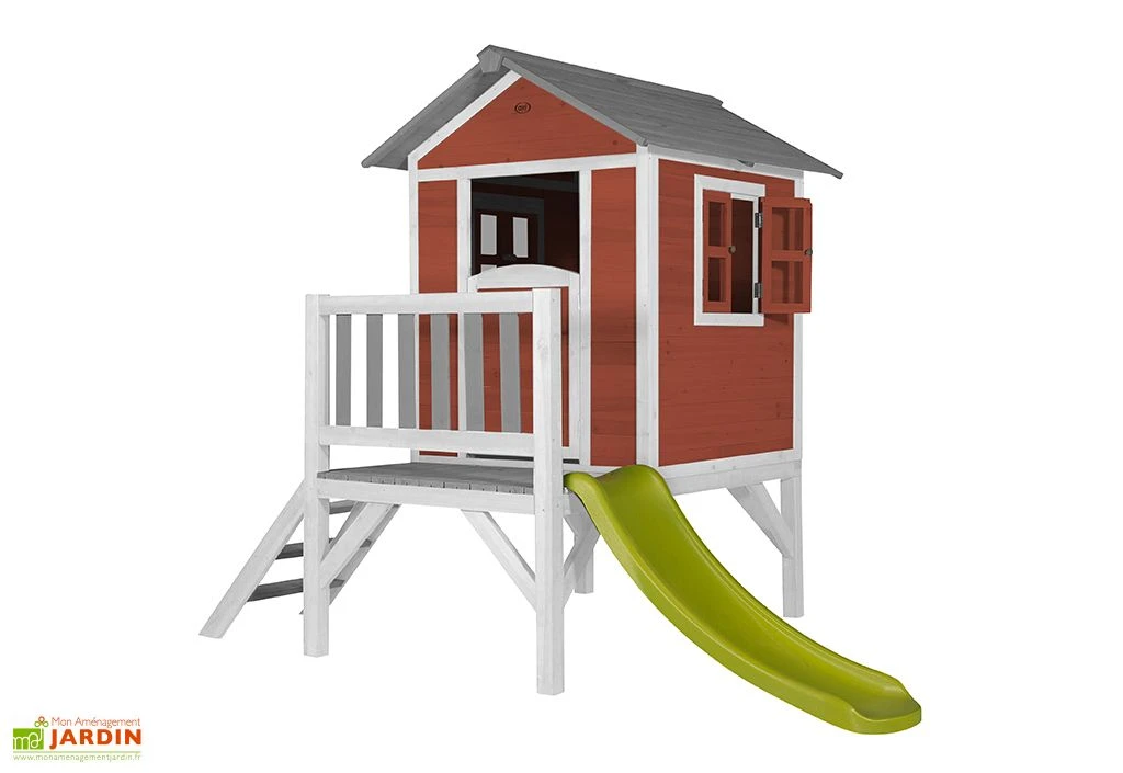 La maisonnette en bois de la marque Axi est montée sur pilotis. Elle mesure 1,67 m de longueur, 2,61 m de largeur et 1,89 m de hauteur. Elle dispose d’un toboggan de 118 cm de longueur.
