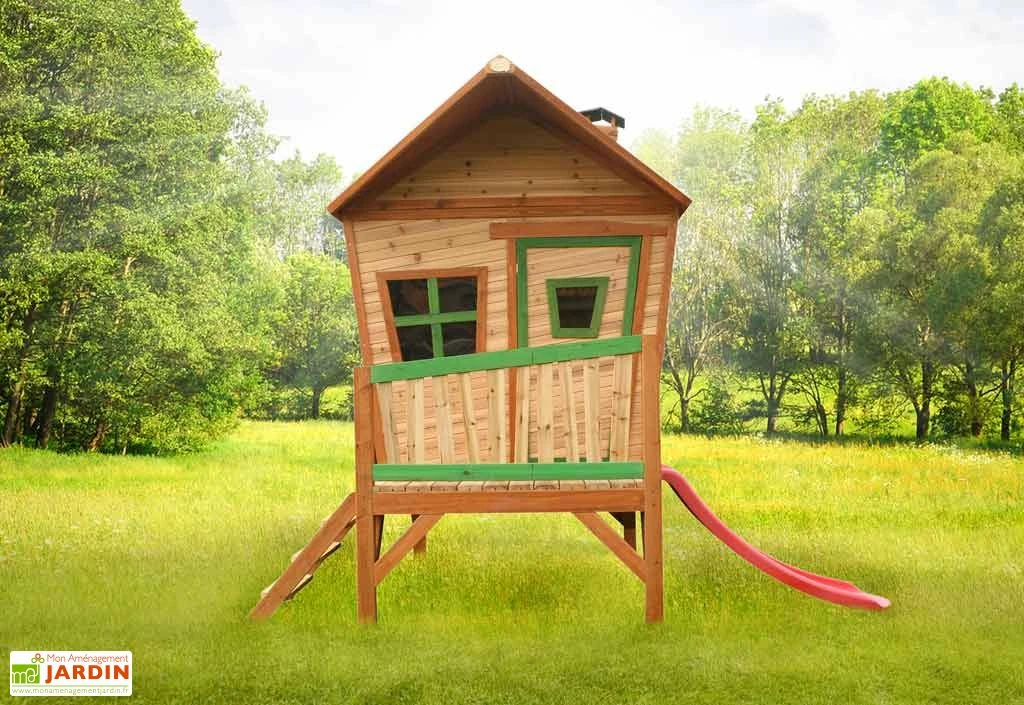La maisonnette pour enfants Iris de chez Axi se compose d’une cabane sur pilotis avec terrasse et toboggan. Le tout est conforme à la norme EN71 et convient pour les enfants âgés d’au moins 3 ans. Elle mesure 1,93 x 2,87 m, pour 2,26 m de haut, et occupera donc une surface de 5,53 m² dans votre jardin. Cette cabane en bois est livrée en kit et devra être montée par vos soins (temps de montage : environ 1h30).