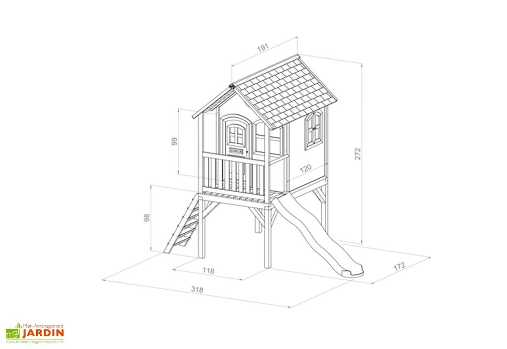 La cabane répond aux exigences des normes EN71-1, EN71-3, EN71-8. Elle est en bois FSC de hemlock et de cyprès (pour la toiture) non traités mais naturellement résistants à la moisissure et aux insectes. Ses dimensions totales (incluant le toboggan et l’échelle) sont de 3,18 x 1,72 x 2,72 m (l, l, h) et elle possède une porte et quatre fenêtres. Elles sont en plexiglass et vous pouvez en ouvrir et fermer 3 grâce à un aimant.