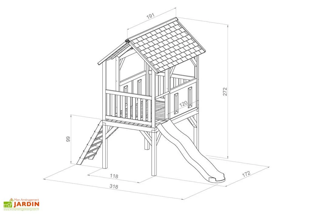 Cette cabane en bois est idéale pour les enfants à partir de 3 ans. Elle est montée sur pilotis et possède un toboggan d’une longueur de glisse de 180 cm. Le tout affiche des dimensions de 1,72 x 3,18 m, pour 2,72 m de haut, et vous sera livré en kit. Vous devrez alors procéder vous-même à l’installation de cette aire de jeux (temps de montage : environ 2h30). Notez enfin que cette maisonnette en bois est conforme aux normes CE et EN71.