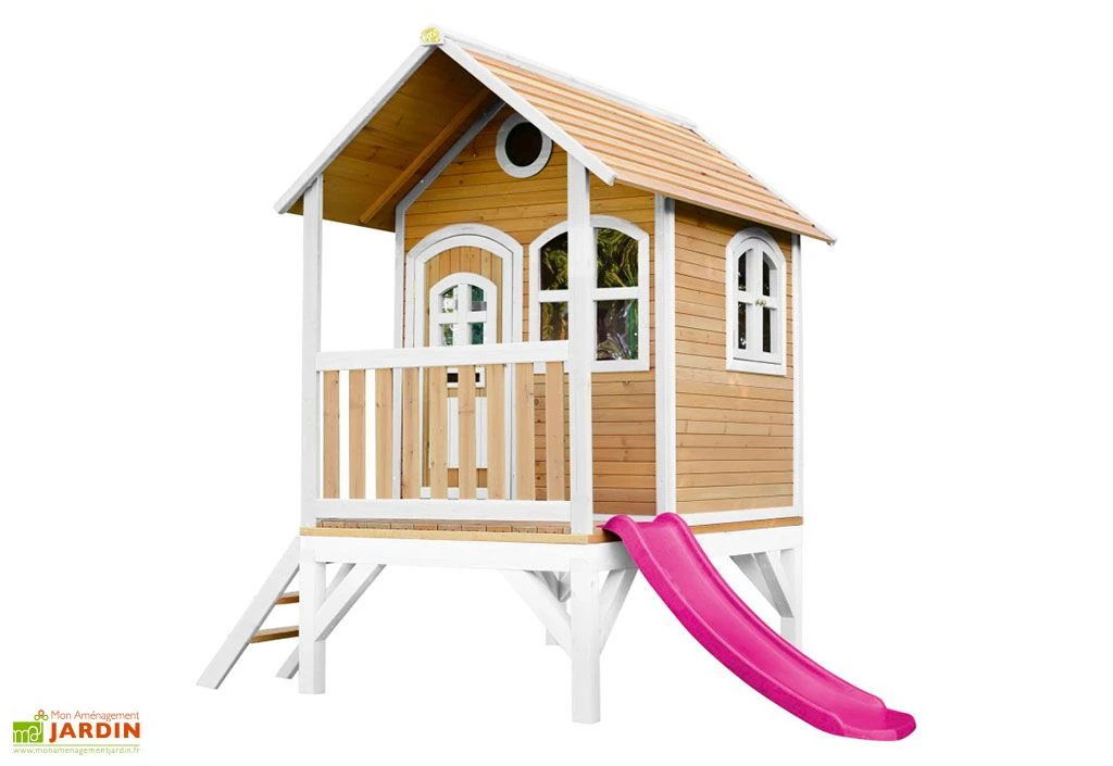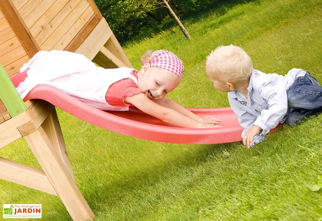 La maison pour enfant Tom de la marque Axi est conçue en bois de hemlock et cyprès. Cette cabane est une véritable aire de jeu pour votre enfant. Elle est montée sur pilotis et possède une petite terrasse accessible par une échelle. Votre enfant pourra en redescendre grâce au toboggan de 1,18 m dont elle est équipée.