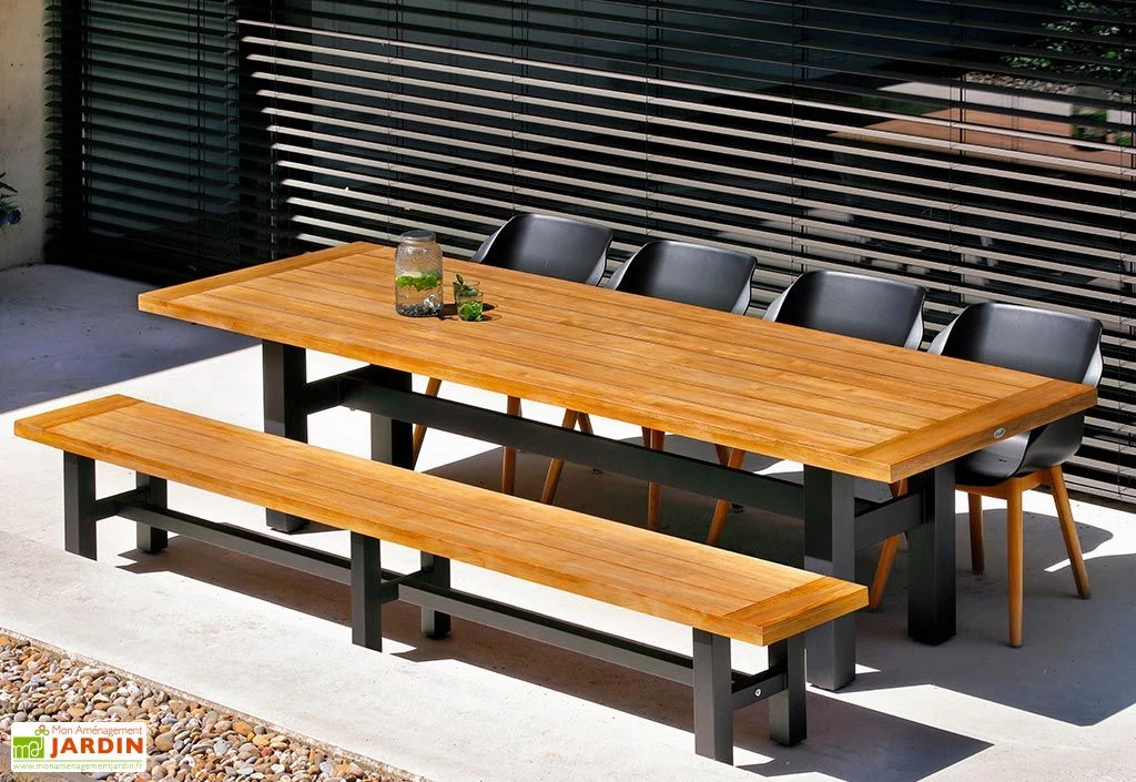 L’assise de 42 x 300 cm de ce banc en bois, suffisamment grande pour accueillir jusqu’à quatre personnes, repose sur un piètement en aluminium couleur gris anthracite. Solide et lĂ©ger, l’aluminium possède Ă©galement l’avantage d’être insensible Ă la rouille, mĂŞme sans traitement de protection.Â