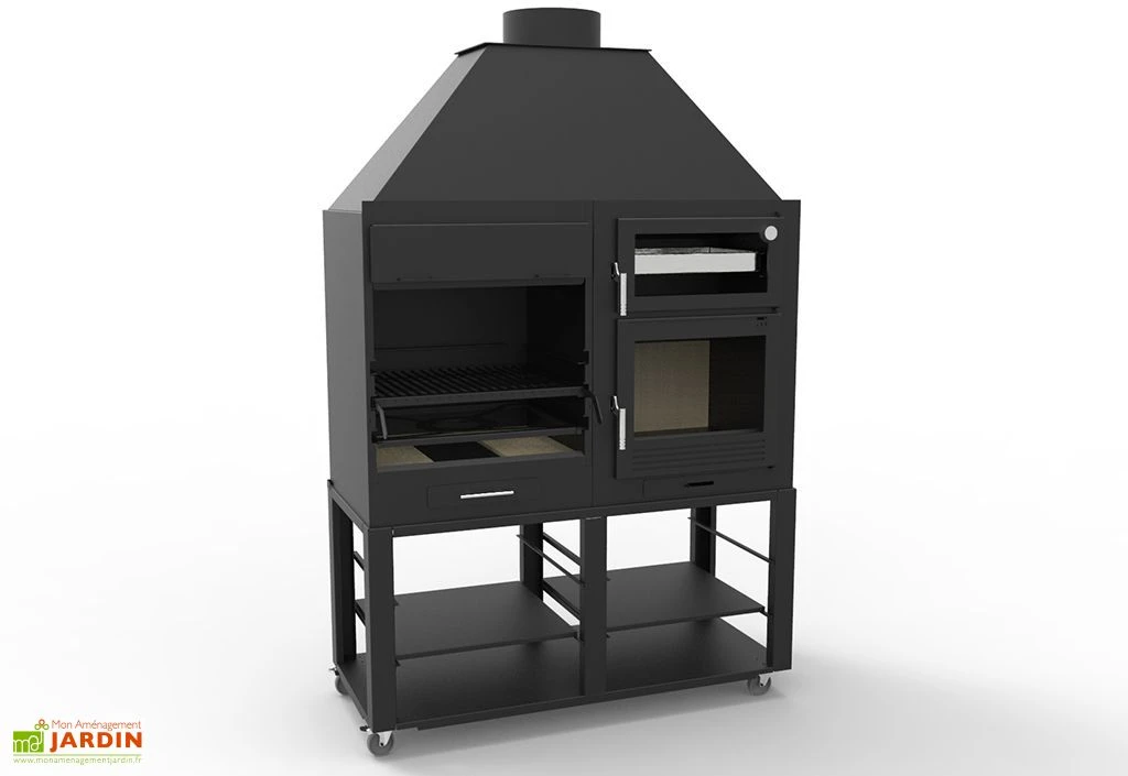 Très complet, ce barbecue à charbon et bois intègre un four et propose même un support pour poêles et plats en acier. Il s’agit d’un modèle à poser ou à encastrer, selon la manière dont est aménagé votre jardin. Un chariot à roulettes est par ailleurs disponible dans l’onglet « accessoires » de sorte à le déplacer facilement. Notez qu’un plat en inox de 45 x 35 cm est inclus.