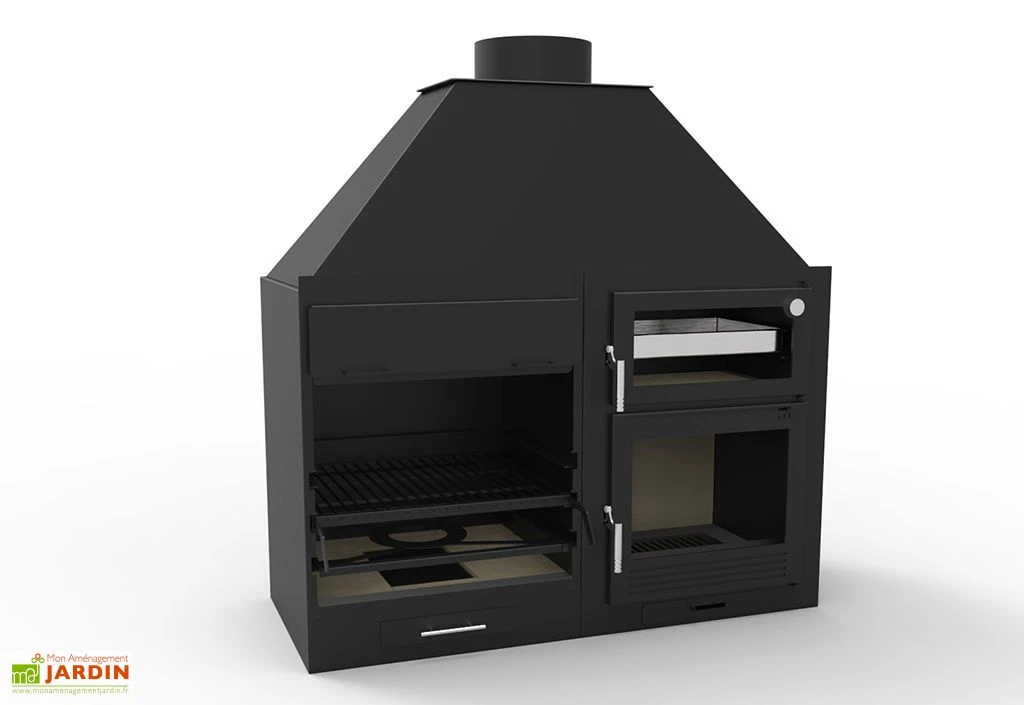 Le four possède quant à lui un foyer de 48 x 39 x 22 cm, situé en-dessous de la chambre de cuisson, fermé par une porte et isolé à l’aide de vermiculite. Les vitres des portes du four et de son foyer sont conçues pour résister à de très hautes températures, jusqu’à 750°C. Le four et le barbecue sont accompagnés de tiroirs pour la récupération des cendres et la fumée sera évacuée par une cheminée commune.