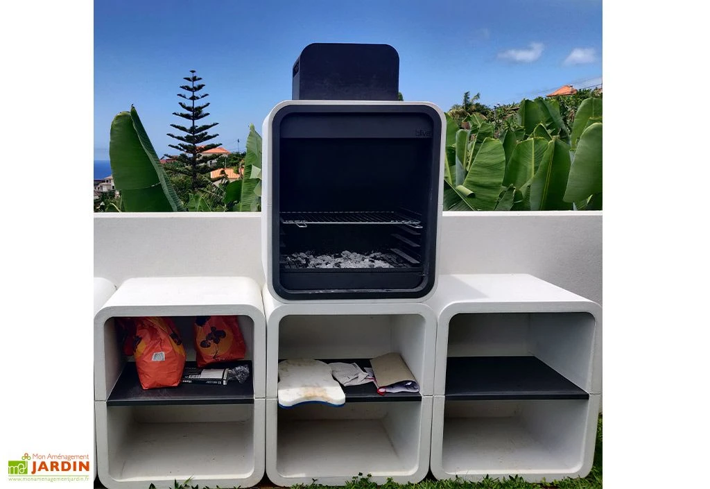 Ce barbecue design de chez Blive profite d’un look à la fois moderne et original qui lui permettra de ne pas passer inaperçu dans votre jardin ! Il est composé de différents modules à assembler soi-même, ces derniers étant fabriqués en béton fibré hydrofuge, un matériau insensible à l’humidité et autres agressions extérieures, et ce sans exiger d’entretien particulier. La zone de cuisson est pour sa part revêtue de métal traité anti-corrosion et recouvert de peinture thermorésistante, le tout complété par une cheminée permettant de faciliter l’évacuation des fumées.