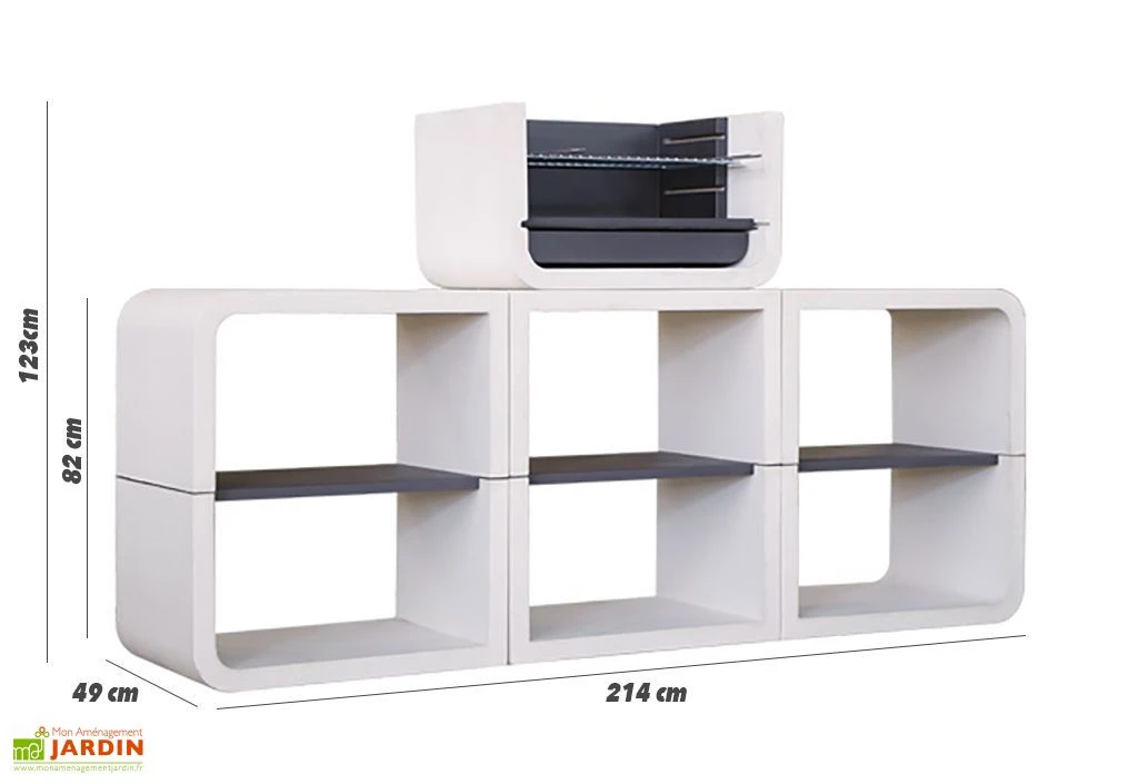 Ce barbecue de la marque Blive est doté d’un design moderne qui lui permettra de s’intégrer facilement dans bien des extérieurs, qu’il s’agisse d’un jardin ou d’une terrasse. Il s’agit d’un modèle composé de plusieurs modules en béton fibré hydrofuge, un matériau extrêmement robuste qui résistera à l’humidité comme au gel ou autres intempéries, le tout sans exiger le moindre entretien. Le foyer est pour sa part équipé de plaques métalliques traitées contre la corrosion et recouvertes de peinture thermorésistante, ce qui lui garantit une bonne tolérance aux températures très élevées.
