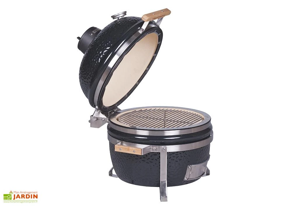 Ce kamado est en effet équipé de deux ouvertures réglables, en bas de la cuve et au niveau du couvercle, ce qui permet d’ajuster la température afin de cuire plus ou moins lentement vos aliments. Le matériau utilisé pour sa conception, de la céramique, possède également de belles qualités, notamment en termes de diffusion de la chaleur, et permet de contrôler plus facilement la température. Notez que ce type de barbecue fonctionne avec du charbon de bois.