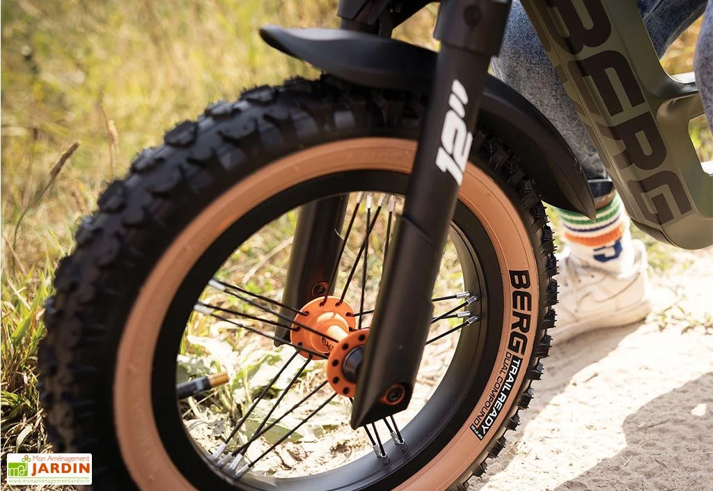 Au look sportif, cette draisienne de la gamme Biky Trail permettra à votre enfant de se faufiler dans les chemins accidentés sans aucun risque ! Elle est équipée de deux roues robustes cramponnées de 12 pouces, dotées de garde-boues en plastique noir pour éviter les éclaboussures lorsque le sol est humide. Le cadre du vélo d’équilibre est en magnésium, dans un coloris vert, et ce dernier intègre une double fourche en aluminium à l’avant.