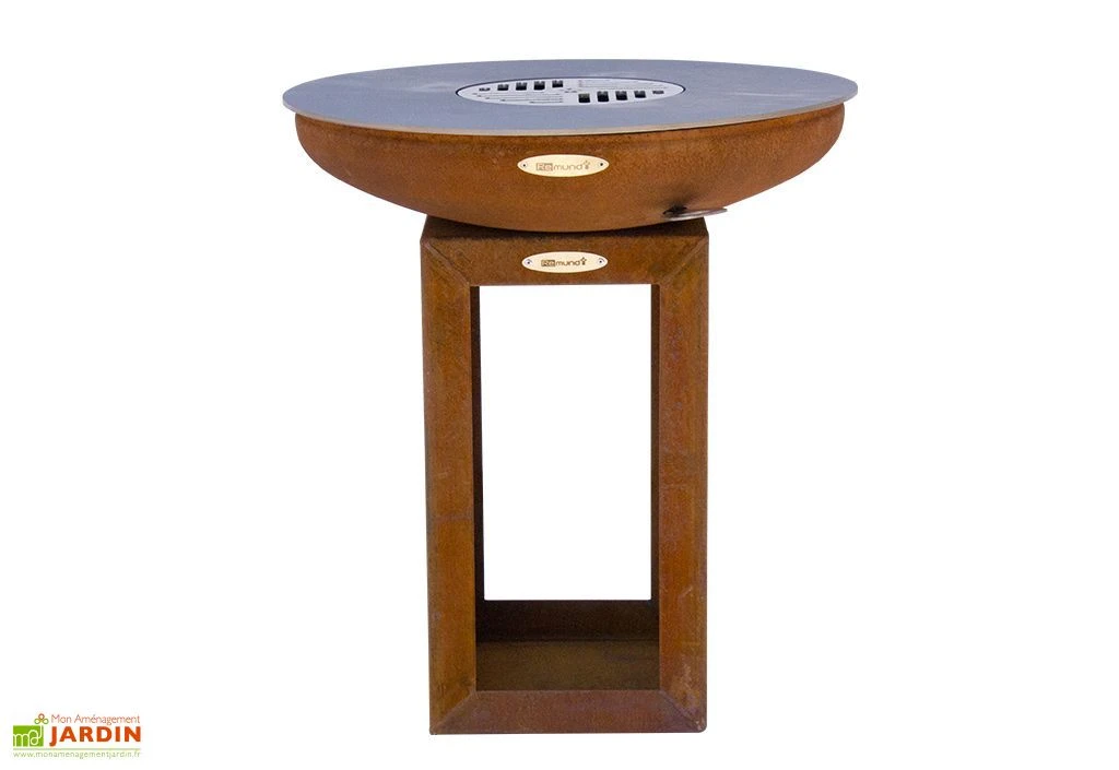 Le braséro barbecue est fabriqué de façon artisanale. Son corps en acier a subi un processus de corrosion, naturelle qui n’altère aucunement sa solidité, offrant un design vintage particulièrement apprécié dans le jardin. Il mesure 71 cm de hauteur et dispose d’une plaque de cuisson de 62 cm de diamètre. Sa plaque de cuisson est en acier inoxydable, ainsi que sa grille de 25 cm de diamètre.