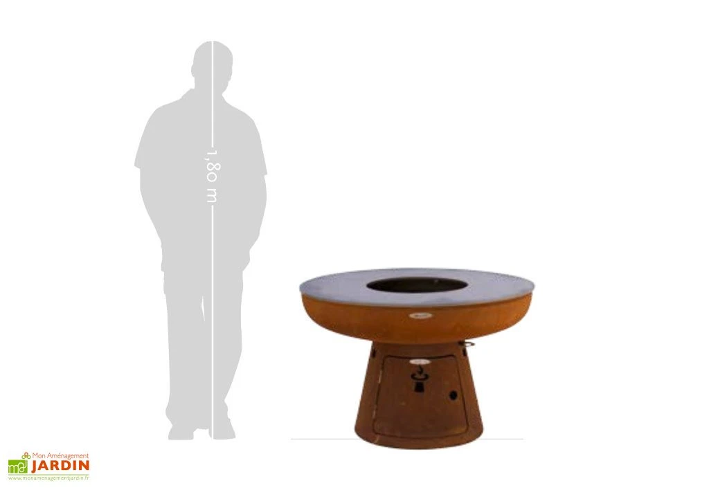 Le braséro extérieur mesure 68 cm de hauteur. Il est facile à utiliser, avec un tirage qui se règle manuellement. Il fonctionne aussi bien au bois qu’au charbon de bois. Très solide, il ne demande aucun entretien et peut rester dehors toute l’année. Parfaitement stable, il pèse 85 kg.