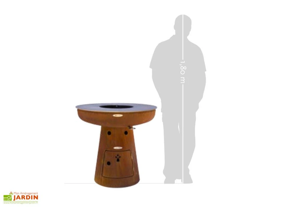 Le braséro en acier mesure 79 cm de hauteur. Sa plaque de cuisson en inox mesure 82 cm de diamètre vous permet de disposer de plusieurs zones de chauffe. Vous pouvez ainsi choisir où déposer les aliments suivant la cuisson dont ils ont besoin. La température varie de 100°C à 350°C suivant la zone de chauffe.
