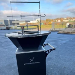 Ce brasero dispose d’un foyer de Ø 45 cm accompagné d’une grande plaque de cuisson en acier qui permet de cuisiner pour un grand nombre de personnes. Ce grand brasero est équipé d’un tourne-broche et vous apporte donc un mode de cuisson supplémentaire afin de pouvoir faire rôtir votre viande.