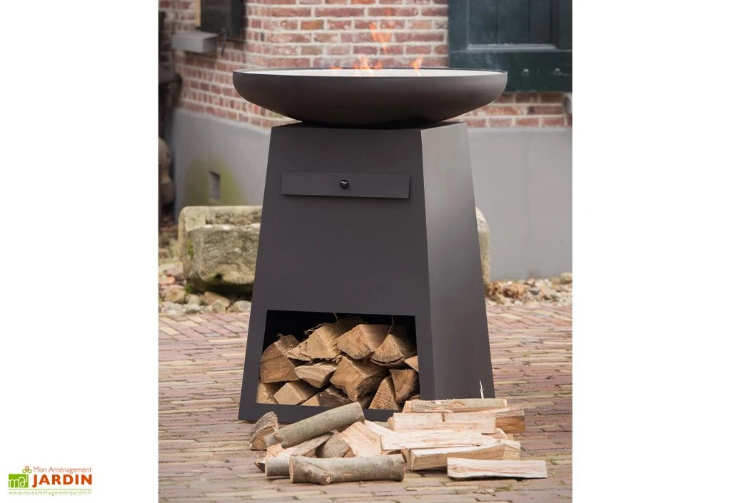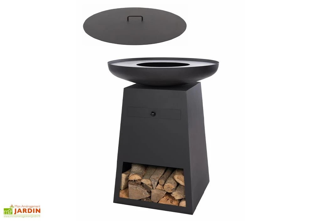 Ce braséro barbecue mesure 60 x 60 x 100 cm et pèse 59 kg. Il est équipé d’un couvercle, d’un espace de stockage pour le bois et d’un récupérateur de cendre qui facilite le nettoyage.