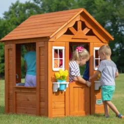 Le cabane est équipée d’une demi-porte avec une ouverture de 35,4 cm de largeur pour 97,9 cm de hauteur et de plusieurs grandes ouvertures de fenêtres. L’intérieur de la maison est aménagé avec un évier, une cuisinière et un téléphone sans fil. Les pots de fleurs ne sont pas inclus.