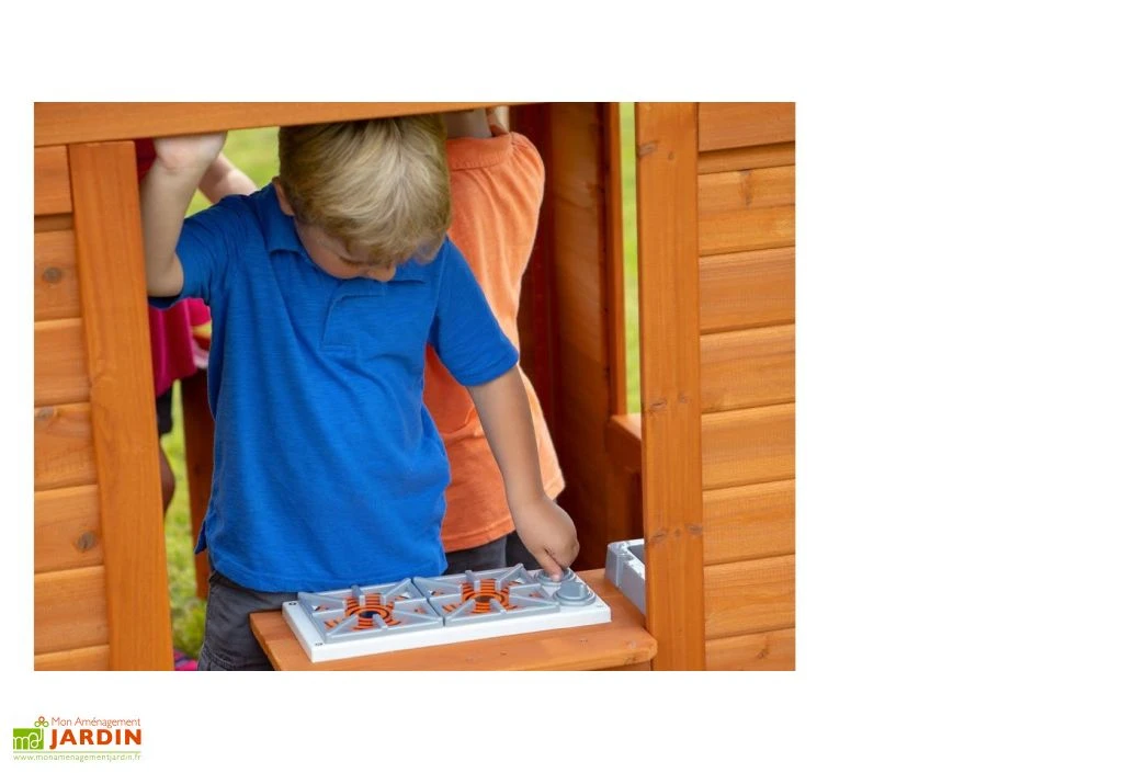 La maisonnette de jardin pour enfants mesure 118,6 cm de profondeur, 106,7 cm de largeur et 140,5 cm de hauteur (dimensions hors tout). La teinture utilisée à des fins esthétiques est à base d’eau. Elle est adaptée à des enfants à partir de 2 ans et jusqu’à 10 ans.