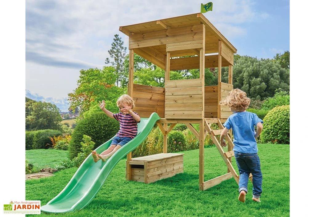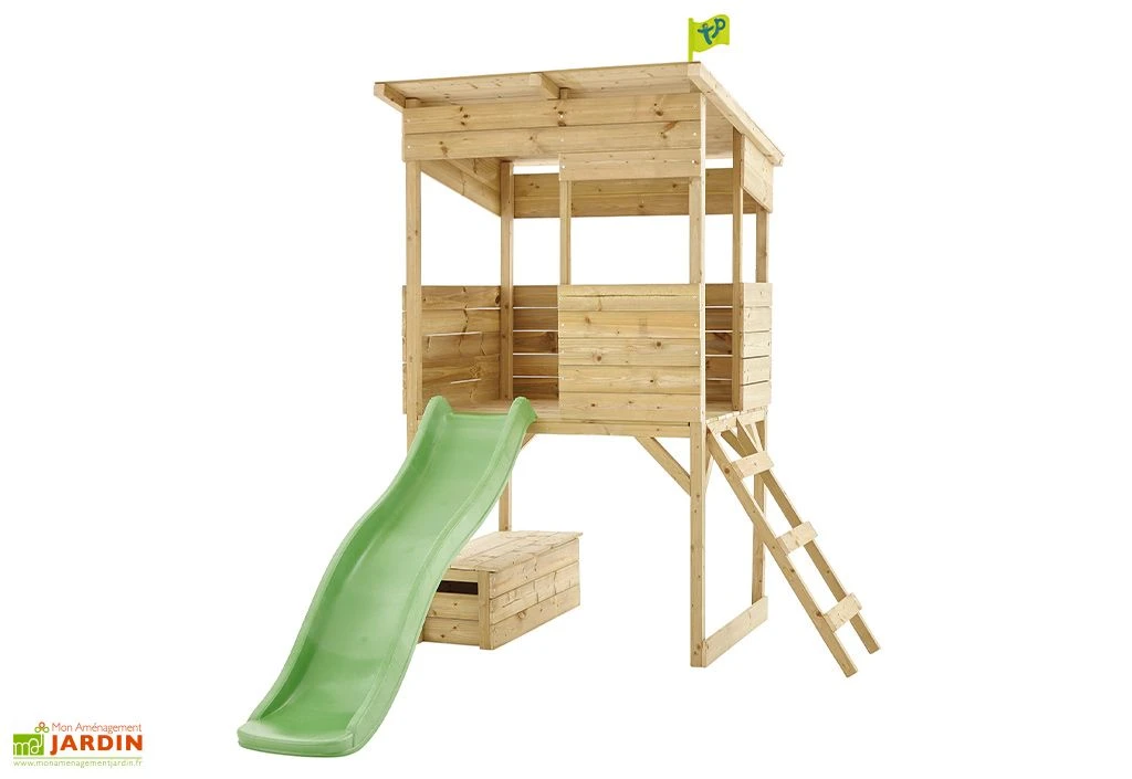 La cabane en bois Treetops de chez TP Toys est une cabane montée sur pilotis avec son toboggan à vague. Elle s’adresse aux enfants dès 3 ans qui pourront s’amuser à grimper, à glisser et à guetter le jardin du haut de leur tour d’observation. L’enfant accède facilement à la plateforme située à 86,5 cm de hauteur grâce à une échelle. Un coffre à jouet en bois est également inclus.