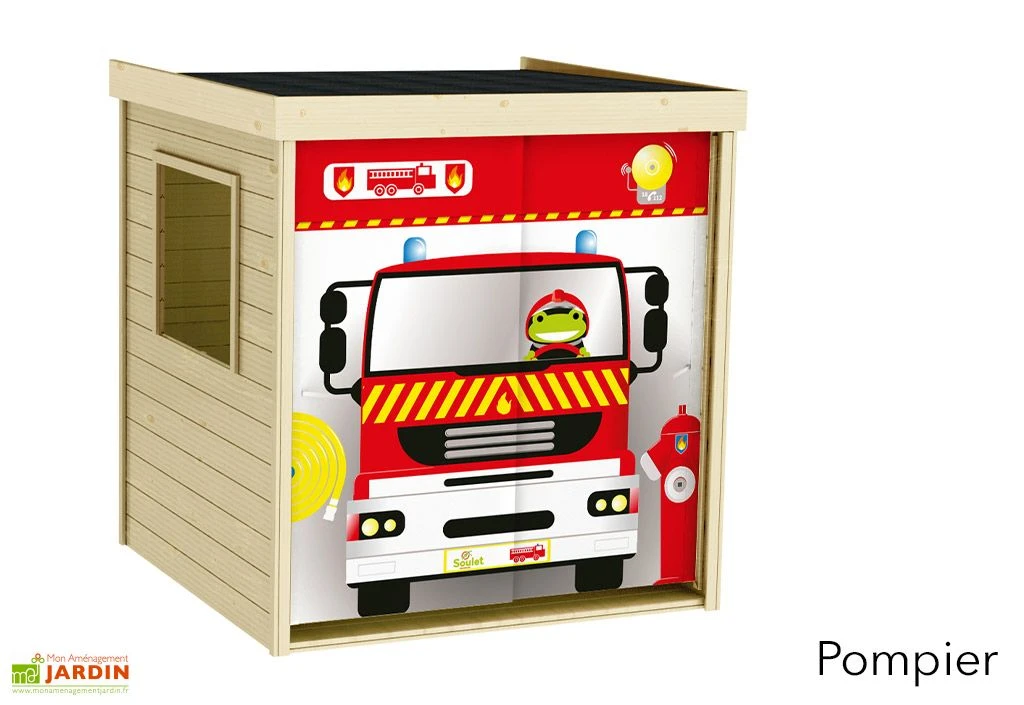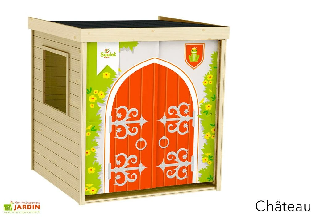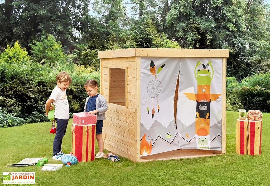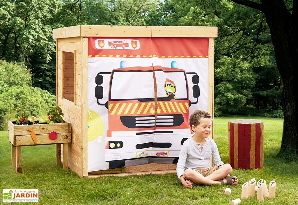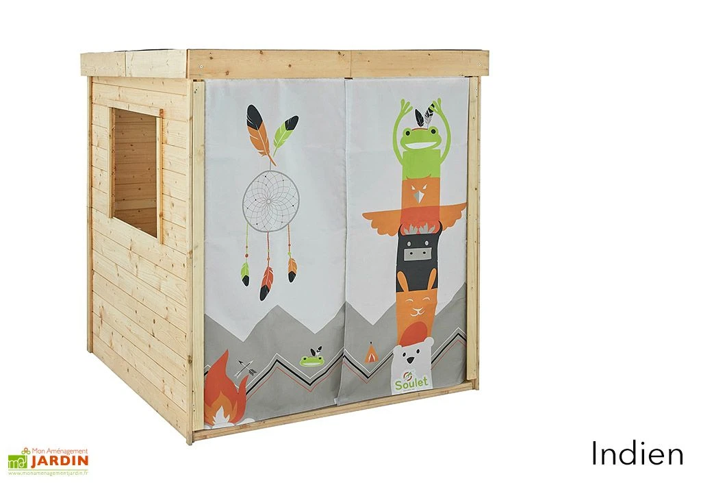 Cette cabane en bois pour enfant de chez Soulet est originale puisqu’elle intègre un rideau en tissu dont les motifs sont disponibles au choix :