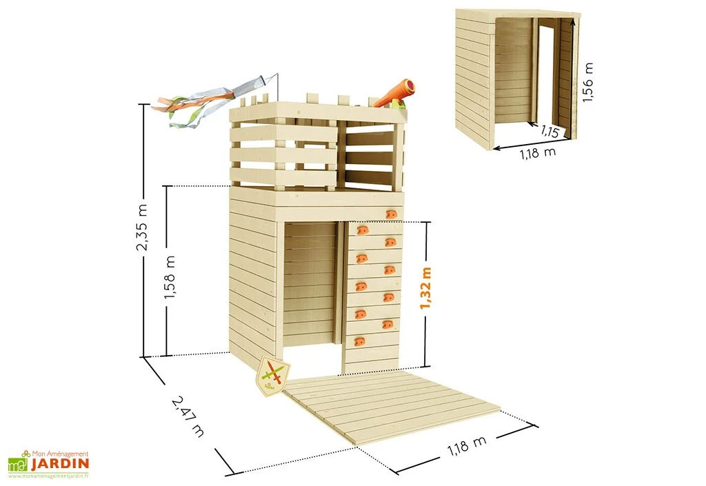 La structure totale mesure 2,47 m de longueur, 1,18 m de largeur et 2,35 m de hauteur et la cabane dispose de 2 grandes ouvertures de 57 x 132 cm (l,h). La plateforme, située à 1,58 m de hauteur, pourra supporter le poids de 6 enfants de 50 kg max. Elle est sécurisée par une rambarde en bois.