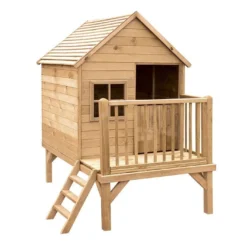 La cabane en bois de la marque Soulet est une maisonnette montée sur pilotis qui mesure 1,75 m de longueur pour une largeur de 1,55 m et une hauteur de 2,10 m. Les pilotis permettent de l’isoler du sol en limitant le contact avec l’humidité.