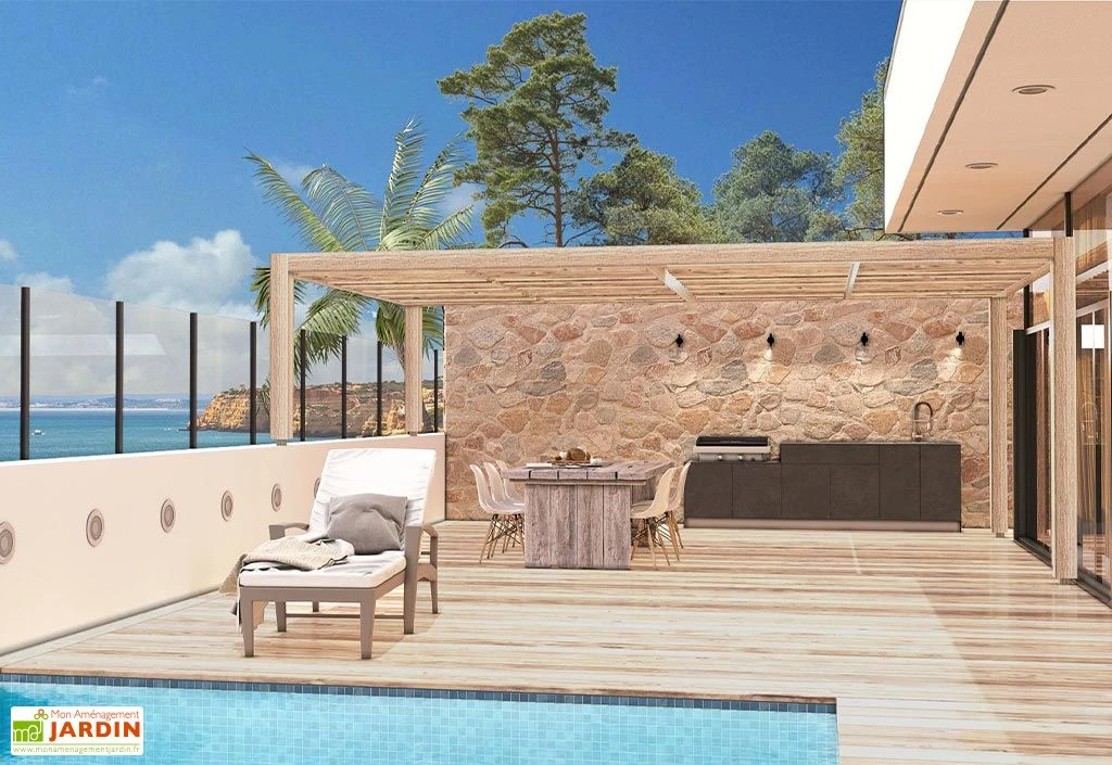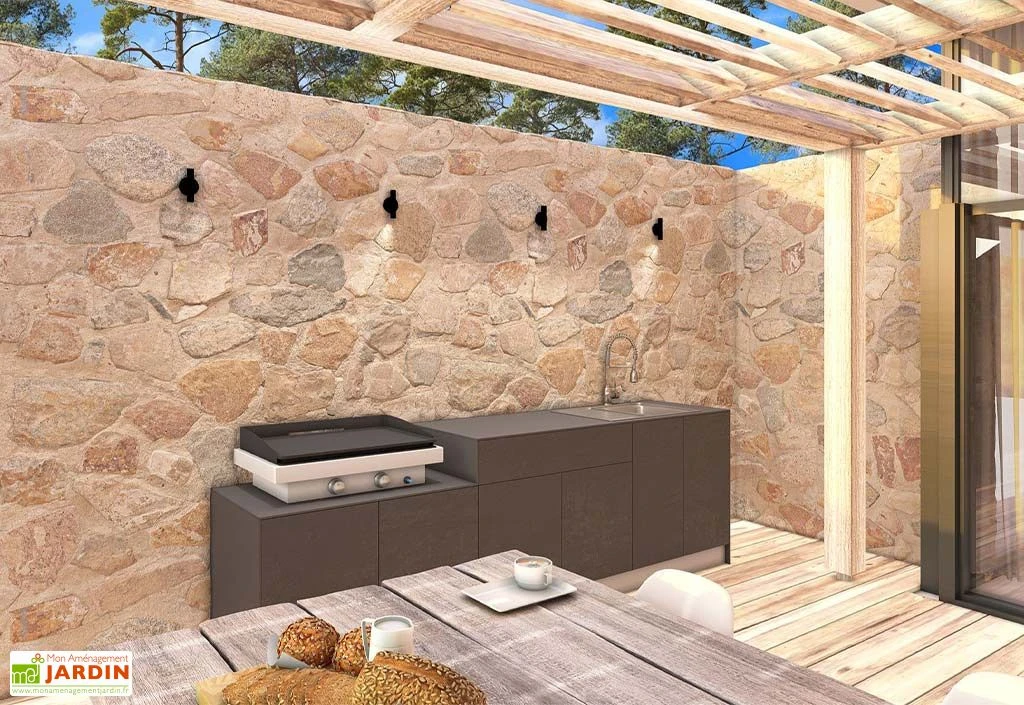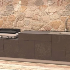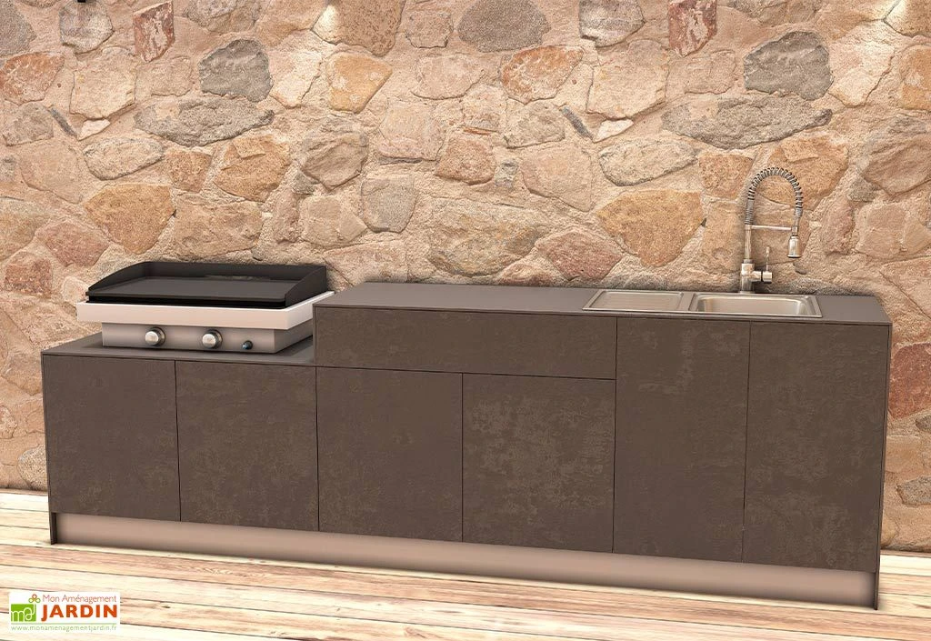 IMPORTANT : Le visuel principal ne présente pas l’évier livré avec la cuisine d’été. Vous trouverez l’évier correspondant dans le dernier visuel. Le mitigeur et la plancha ne sont pas inclus. Une découpe de 35 mm de diamètre est possible sur demande.