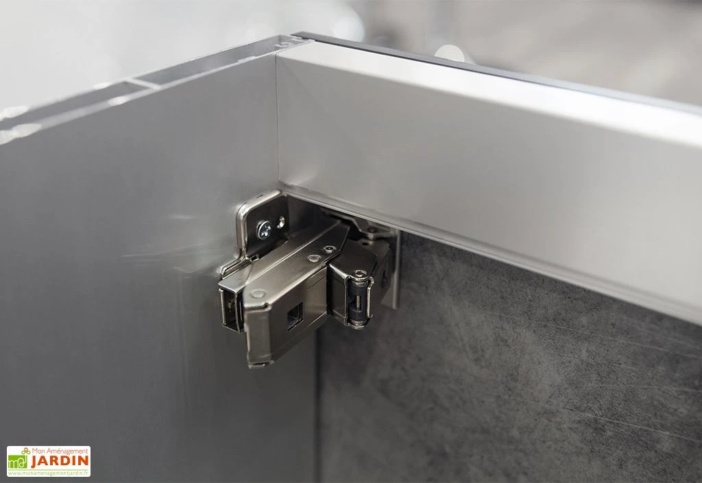 Toutes les portes ainsi que le tiroir de cette cuisine sont équipés d’un système Tip-On pour en permettre l’ouverture grâce à une simple pression. Cette cuisine d’extérieur est très simple et rapide à installer. Si besoin vous pourrez nous contacter pour un accompagnement lors de la pose par le fabricant.
