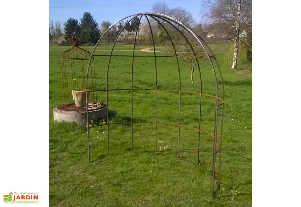 La petite tonnelle en demi-cercle est constituée de tiges de fer en carré plein de 14 mm. Elle affiche une hauteur hors tout de 2,10 m, et un poids total de 70 kg.