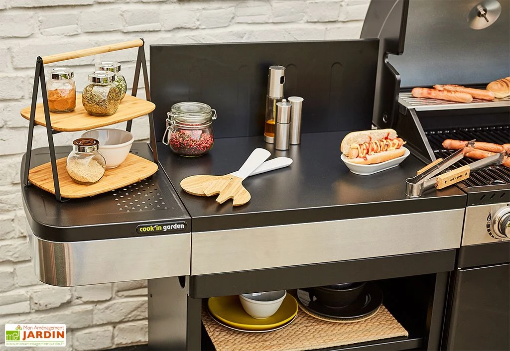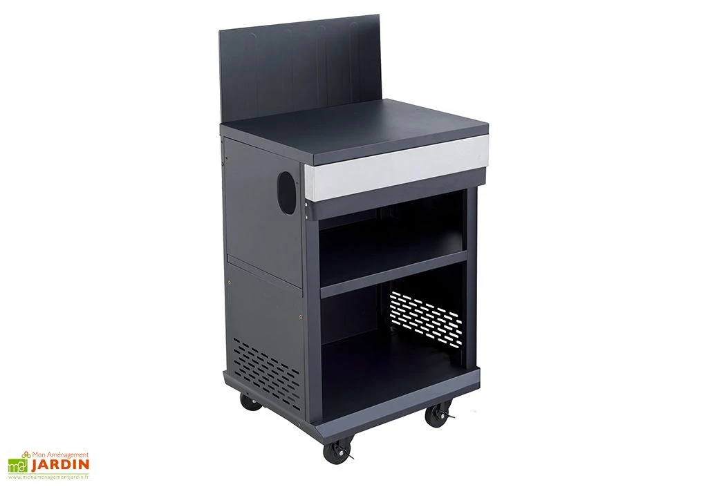 Compatible avec les barbecues Fidgi 3 et 4, cette desserte en métal de chez Cook’in Garden permet d’ajouter un nouvel espace de stockage et de préparation aux barbecues. Elle affiche des dimensions de 60 x 51,5 cm, pour 108 cm de haut et possède une surface de travail de 60 x 45,5 cm.