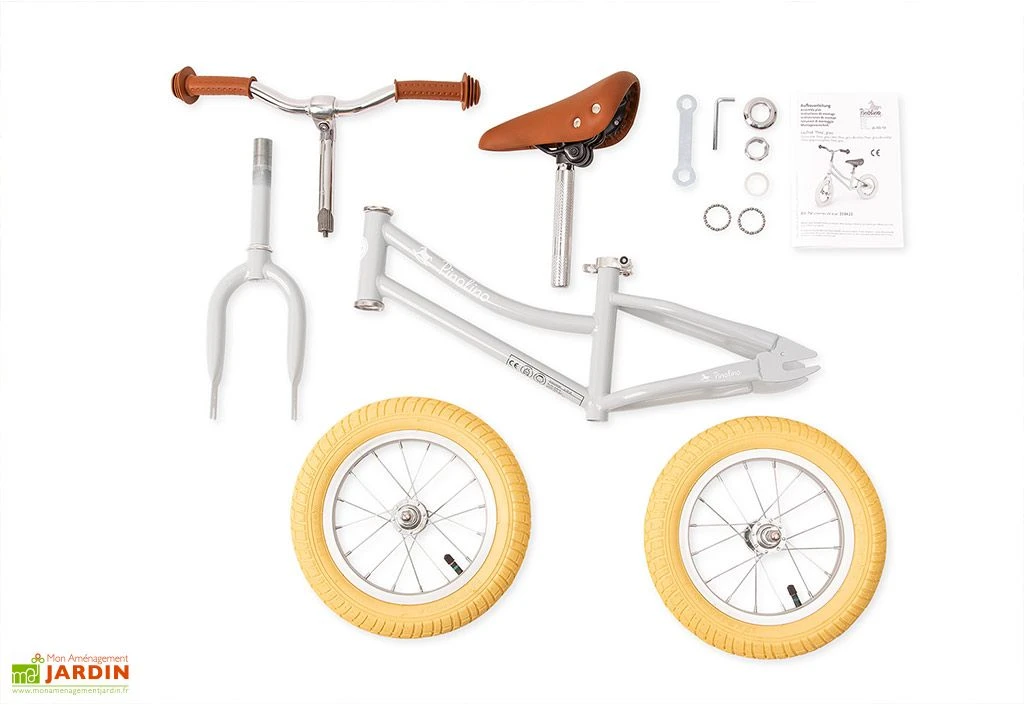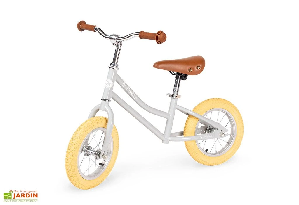 Côté look, la draisienne est parée d’un cadre en métal peint en gris, d’une selle à rivets et de poignées marron, pour un style rétro qui plaira aux petits et aux grands.