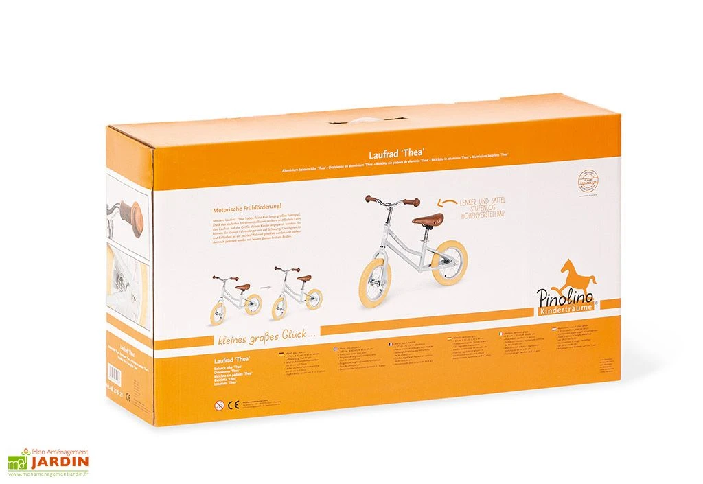 Cette élégante draisienne pour enfant Théa de la marque Pinolino est équipée de jantes en acier et de véritables pneumatiques, garantissant un déplacement fluide et doux du vélo.