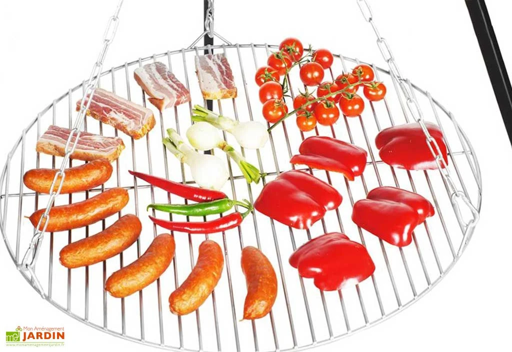 Cet ensemble FarmCook est composé d’un trépied en acier de 180 cm de haut, d’une chaîne de suspension et d’une grille de cuisson en inox. Cette dernière est disponible dans deux tailles au choix, 60 ou 70 cm de diamètre, et l’ensemble se montrera compatible avec les braséros de jardin de la marque. Vous pourrez ainsi faire griller viandes, poissons et légumes au feu de bois en plein cœur de votre extérieur ! Lorsque vous ne l’utilisez pas, le trépied pourra être facilement replié afin de n’occuper que peu de place une fois rangé.