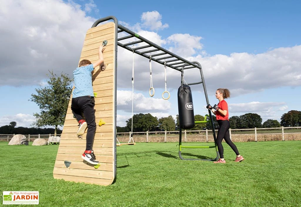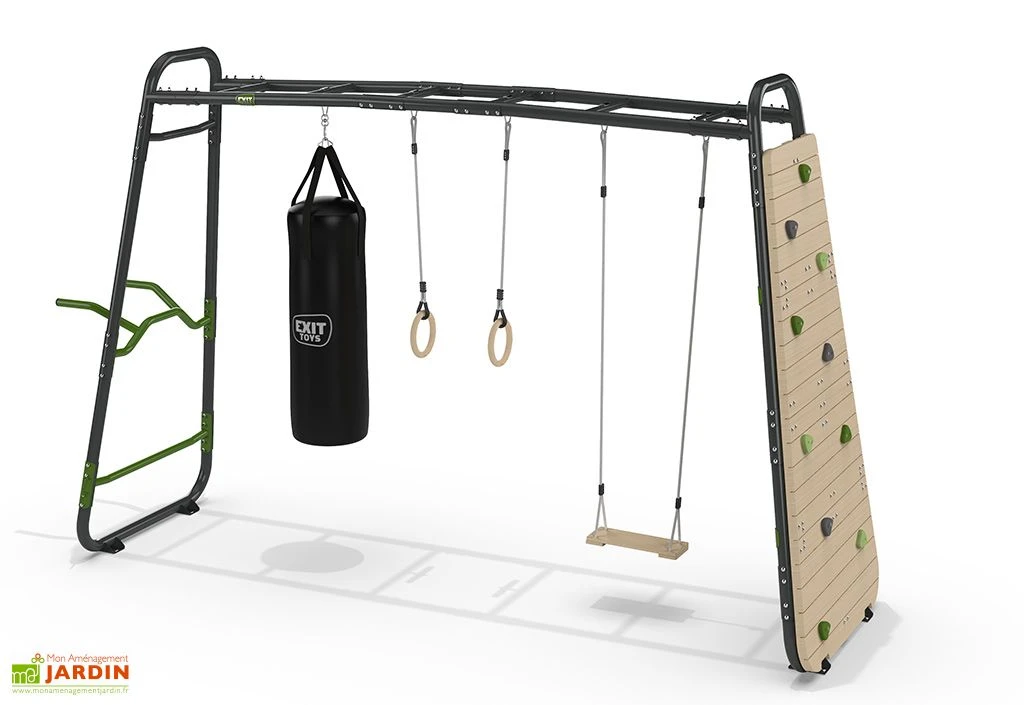 Facilement assemblable, elle dispose d’une barre de singe de 300 x 51 cm située à 234 cm du sol. Cette barre de singe supporte un poids de 100 kg, parfait pour jouer à plusieurs !