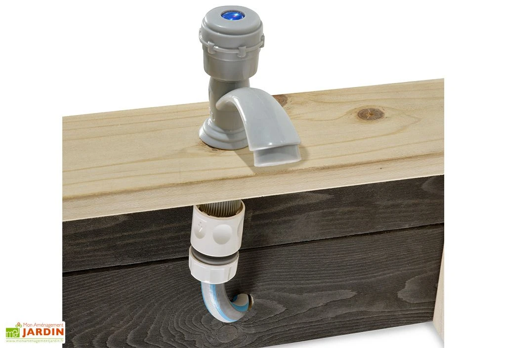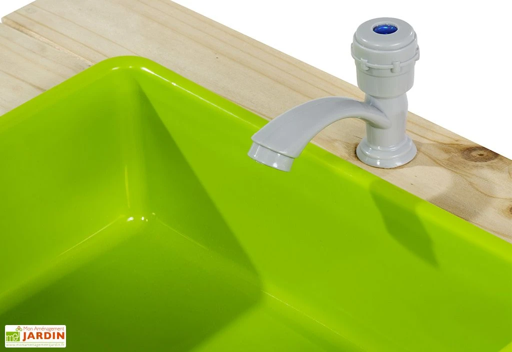 Pour fonctionner correctement, le robinet de l’évier devra être raccordé à un tuyau d’arrosage. L’eau se déversera alors dans un bac en polypropylène d’une capacité de 11 litres. Une fois plein, ce bac couleur vert pomme pourra aisément être ôté afin d’en faciliter la vidange.